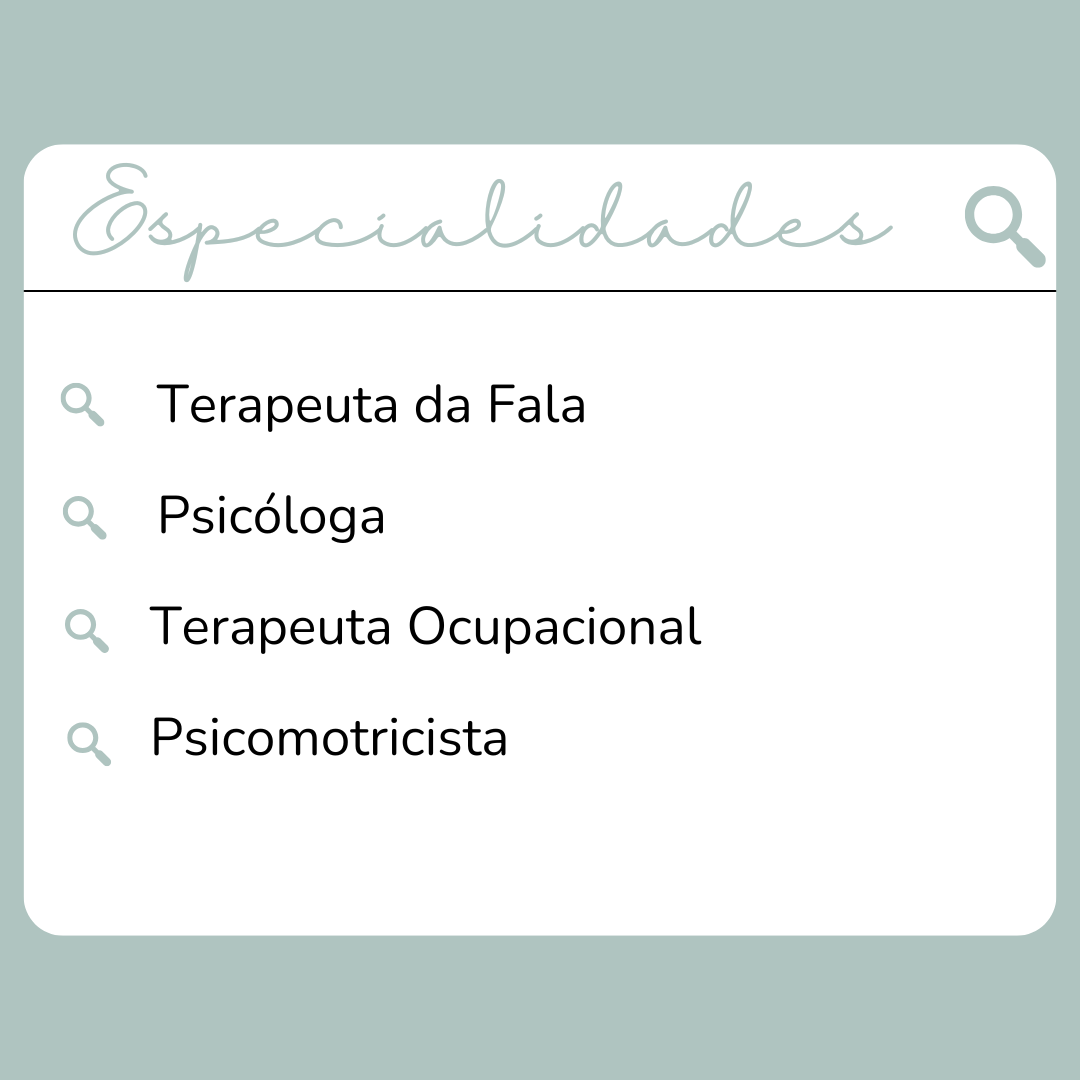 Desta forma contamos com uma equipa multidisciplinar para dar a melhor resposta à s famÃlias que nos procuram. Atuamos nas diferentes áreas de forma a olhar para a criança como um todo.